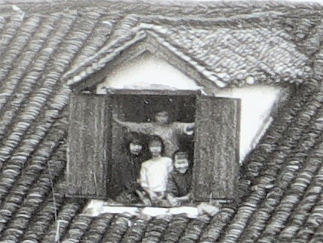 新化信义会医院屋顶阁楼天窗里站着四人在观望比赛,看样子是四个女性,前排三个,后排一个,后排为了能让自己稍微前倾又能稳住身形,双手撑在两边墙壁上,前排右边一位看得开心大笑,不知他们四个是谁家的祖母?谁家的外婆?
