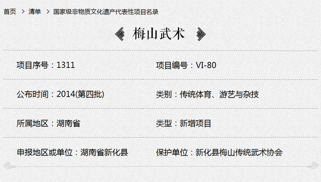 武术起源于中国,是中华民族在与自然博斗的漫长岁月中创造和发展起来的,与中医、书法、京剧一起称为中国四大国粹。而梅山武术是流传于湖南省新化县的传统武术流派,广泛流传于民间,套路短小精悍,分为徒手拳术和器械套路两大类,攻防兼备,对健身有特别效果,2014年11月11日列入第四批国家级非物质文化遗产名录。