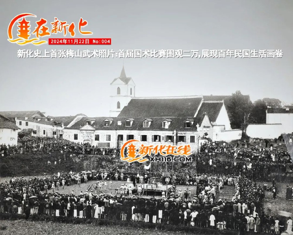 这张照片,信息量非常之大。不但展现了新化信义会的外观,还丰富地再现出了新化第一届国术比赛的盛大场面,宛如看到一幅波澜壮阔的民国生活画卷。画面中人物达二万余,据1932年1月新化县政府查报的人口数为82.69万,可以这么说,现在不少新化人的祖辈就在这照片当中。在现场观看的小孩,就算当年出生抱着的婴儿现在都已年过九十,能记事并且还在世的,没过百岁也将近百岁了,不知道现在还能找到老人回忆起当年的盛况吗?