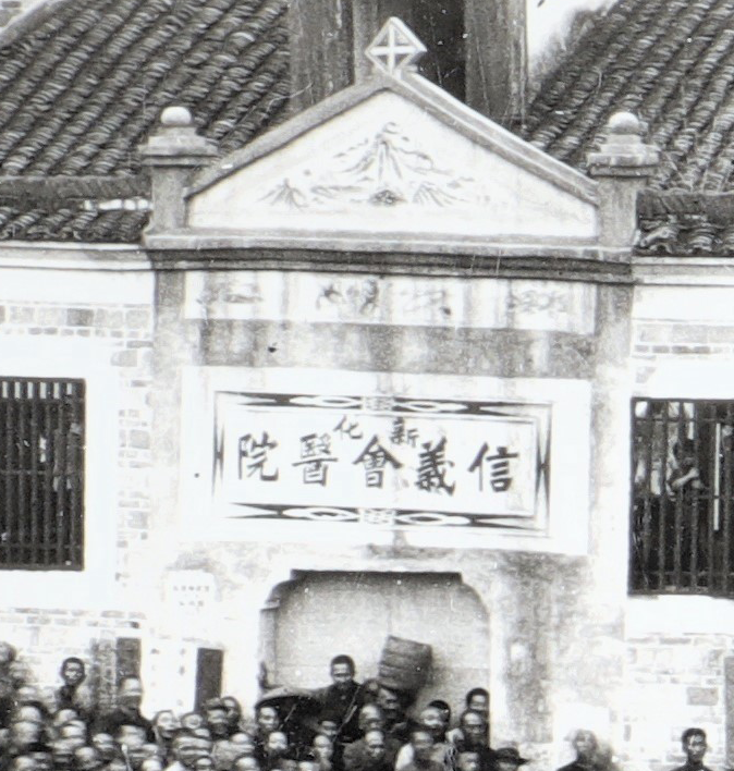 照片中的比武场地,正是县城河西老人民医院的位置,当年此处还是一片田地,叫四亩大丘。田边挤满了人的石砌堡坎上屋边小路,左边是通往青石街,右边是通往承熙寺、洛伽庵、崇阳观,当年叫承熙巷,正是目前青石街通往新化第三小学和第十五中学的小巷,只是经过近百年的发展,沧海桑田,变化太大。路边的一线房屋,建造于1905年,最初是为校舍。1930年4月30日,长沙信义会医院停办,计划迁往新化,1931年4月7日正式迁来,发展成新化信义会医院,就将这所校舍改成了门诊大楼,在最左边开了个入口,门牌上写着“新化信义会医院”五个大字。